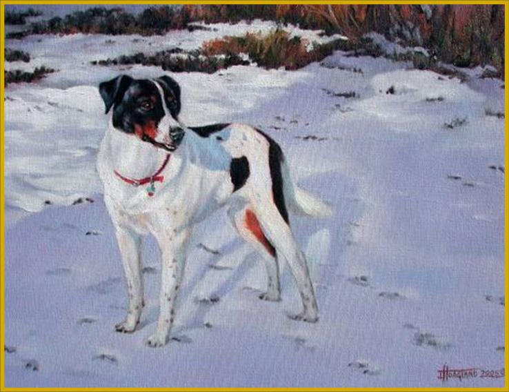 This is a painting of our dog, Chuck, that we rescued from the dog pound nine years ago. He loves the outdoors and especially likes romping in the snow. He’s a great guard dog, faithful companion and even lets the grandkids play horsey with him. |