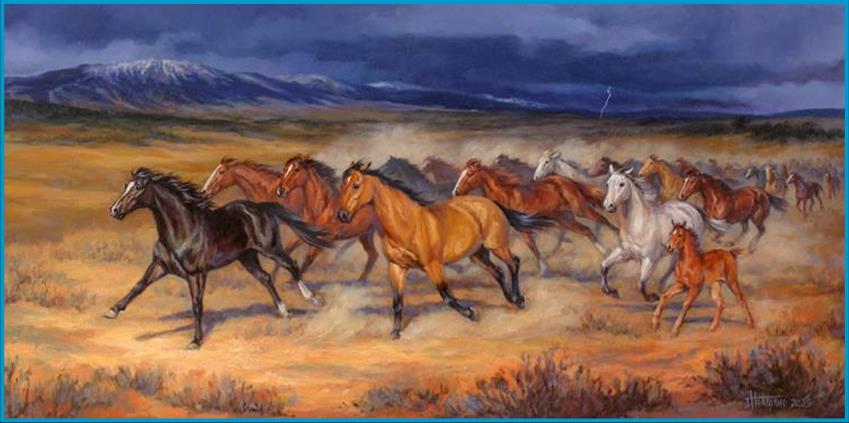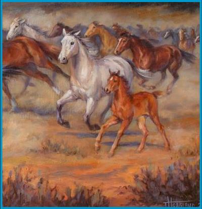 This is a painting I indulged in. I wanted to do a scene of the many horses I have known and imagined them all running wild and free in the open plains of Wyoming.