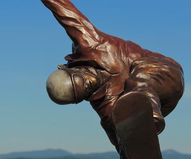 The stylized glacier form that she is launching herself from is also bronze, though it has a patina that resembles the icy colors of a glacier.